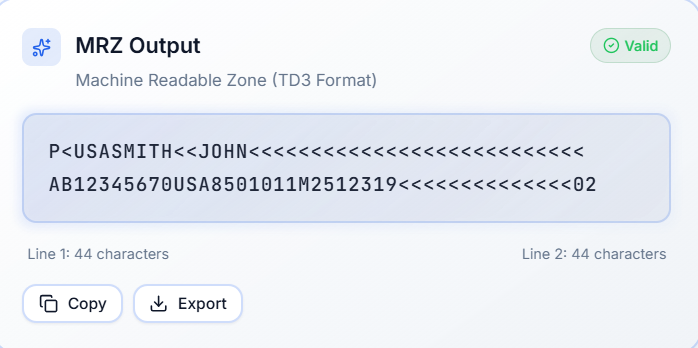 Generate clean MRZ lines with formatting rules, check digits, and export-ready output.