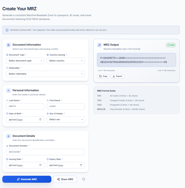 Across mobile and browser-based workflows, users can prepare MRZ strings for passports, ID cards, visas, and related travel document formats. Text is normalized automatically, fields are padded and formatted correctly, and output is ready to copy, share, or export.