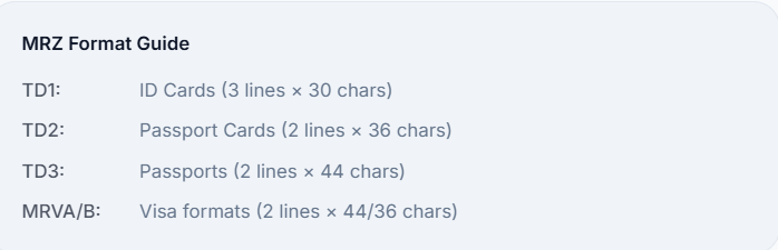 Work with common MRZ standards such as TD1, TD2, TD3, and visa-related layouts.